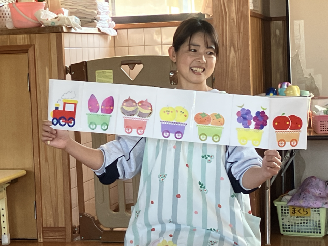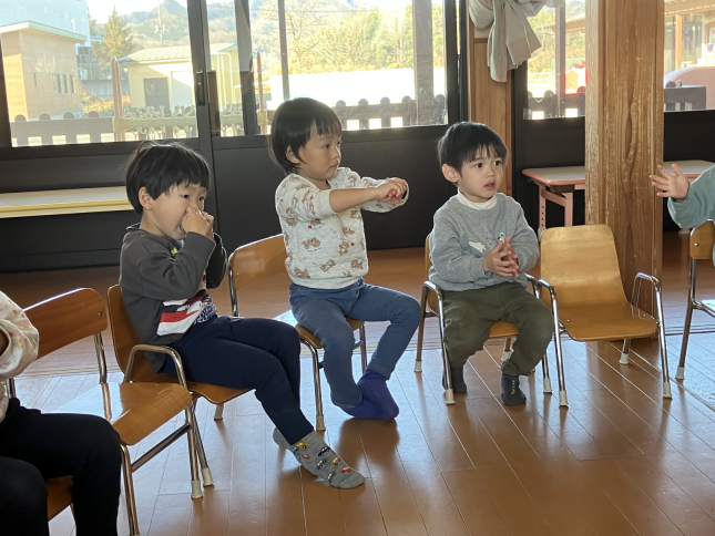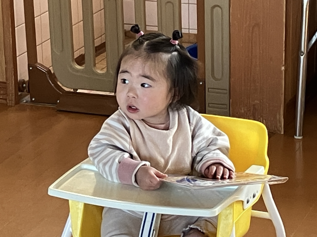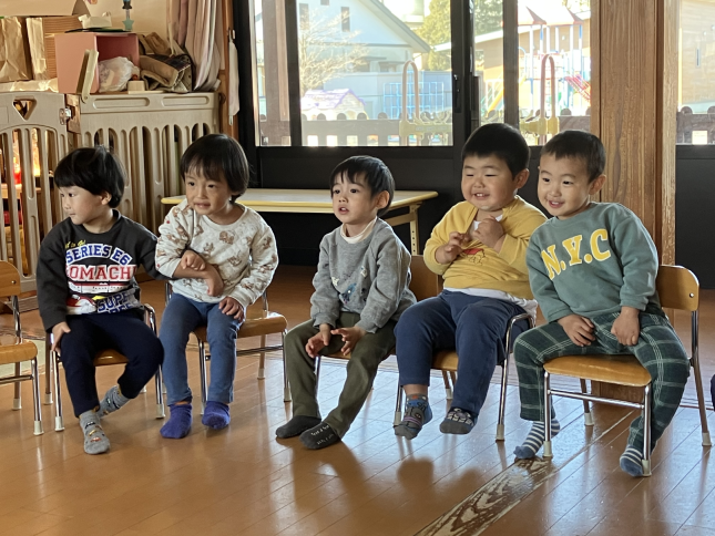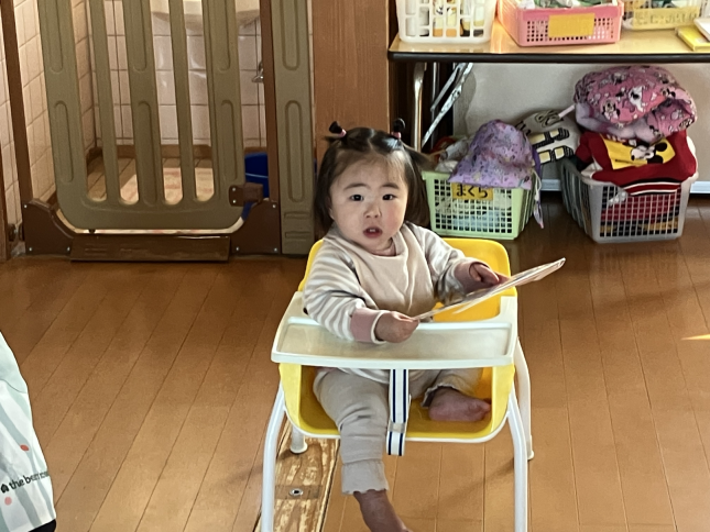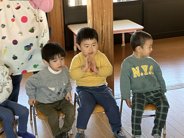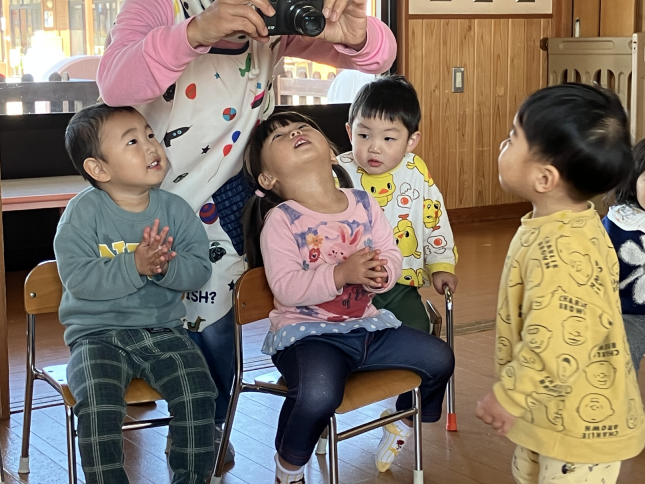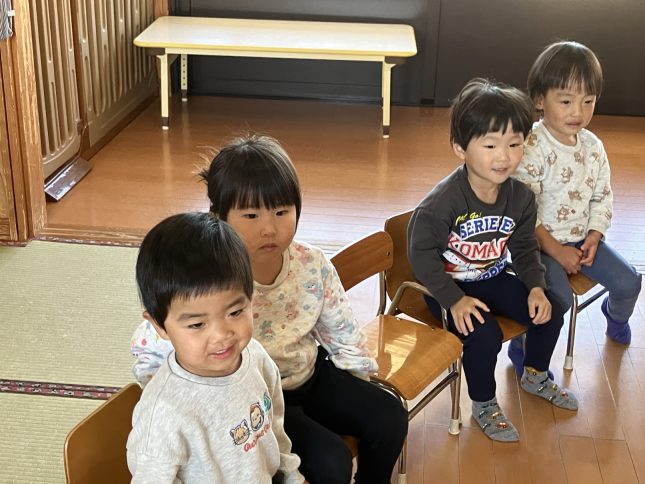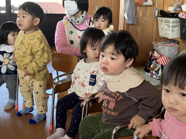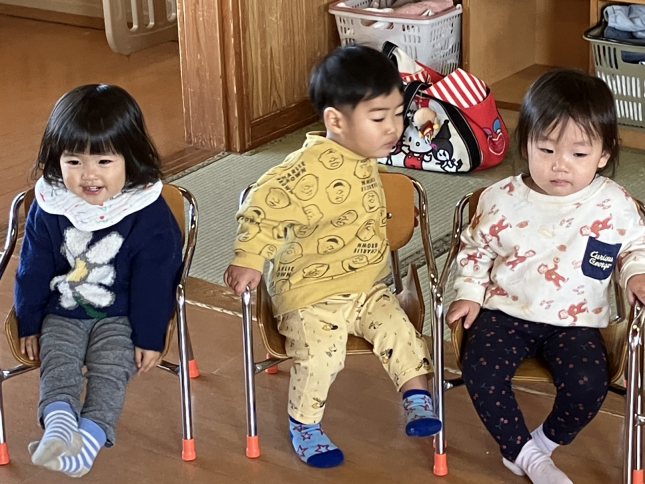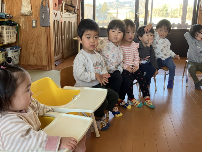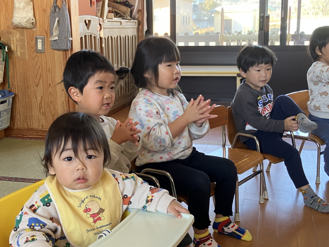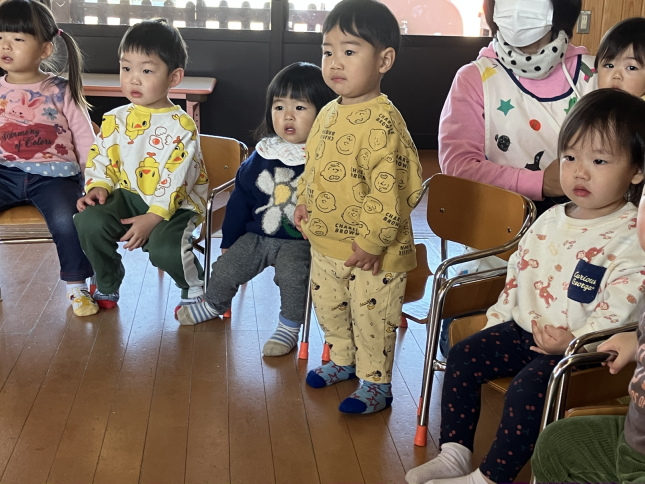 乳児組の誕生月の子は新しいお友だちです。うれしいようなはずかしいような複雑な気持ちです。みんなで楽しむことは一番です。