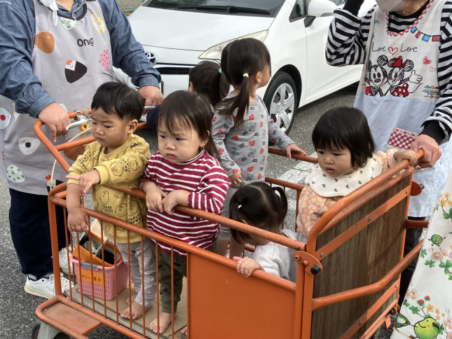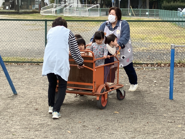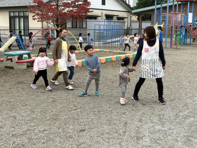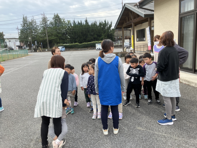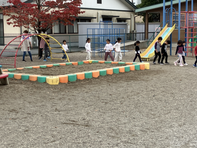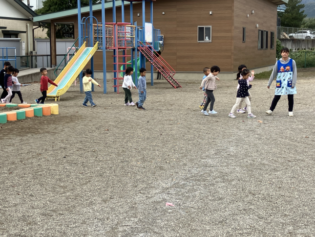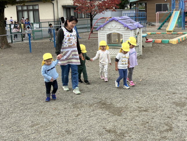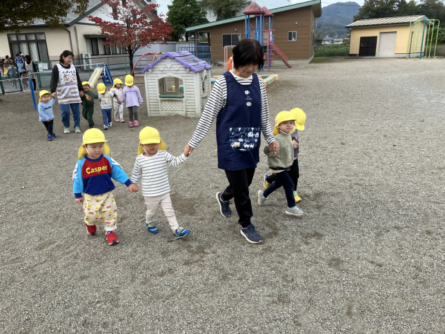 今日は地震の避難訓練がありました。最初は園庭に避難して次は建物崩壊の可能性があるということからコミセンに2次避難をしました。皆神妙な表情で落ち着いて避難できました。