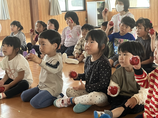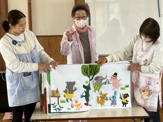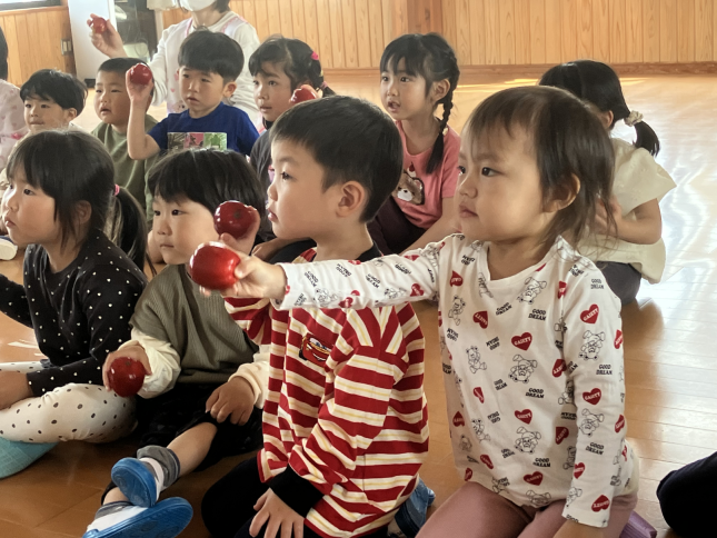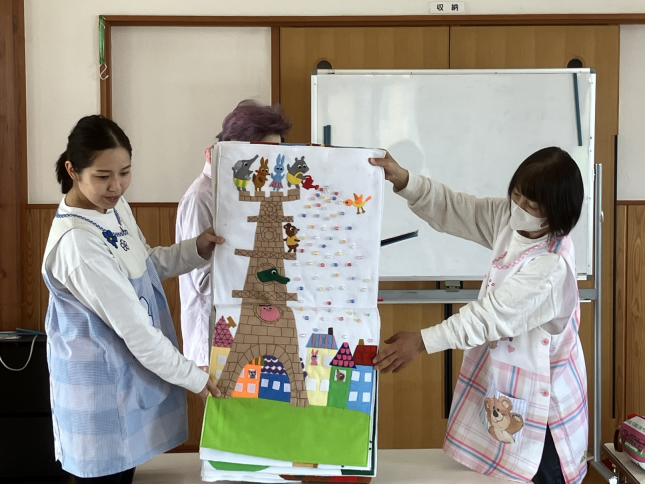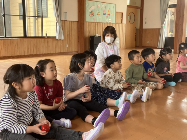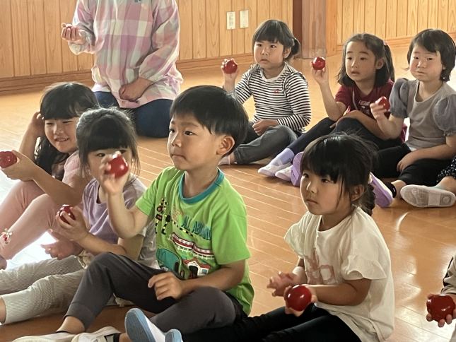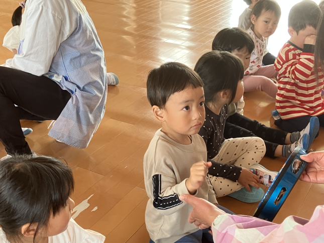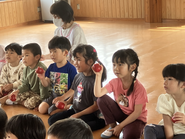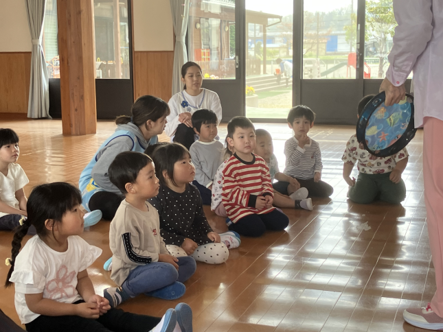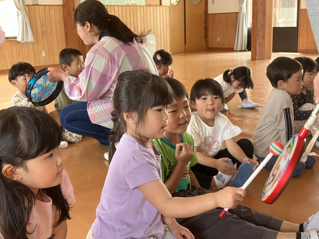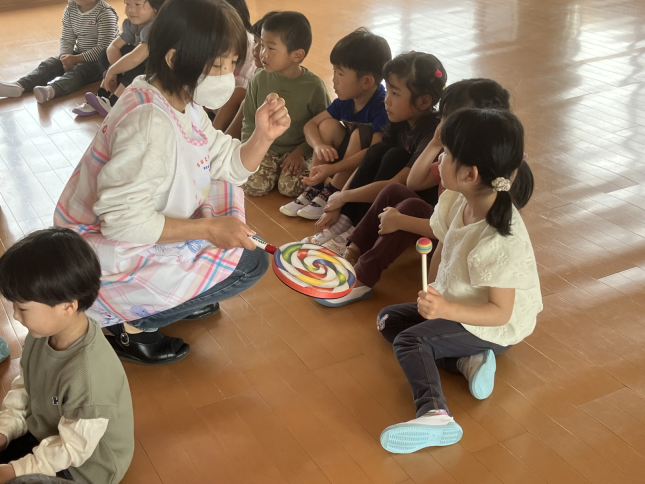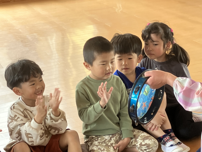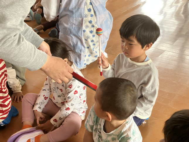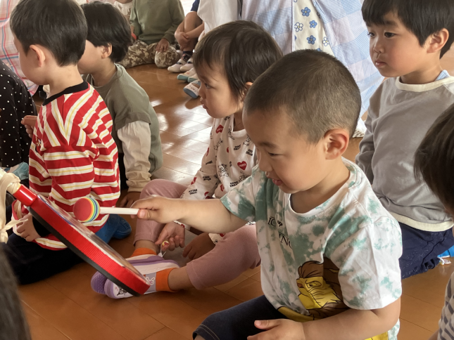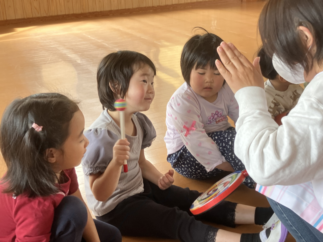 落合先生が来てくださりリズムあそびを実施しました。リズムあそびが大好きなみんなはフェルトでできた絵本のお話を楽しんだり、珍しい楽器を奏でたりして素敵な時間を過ごしました。