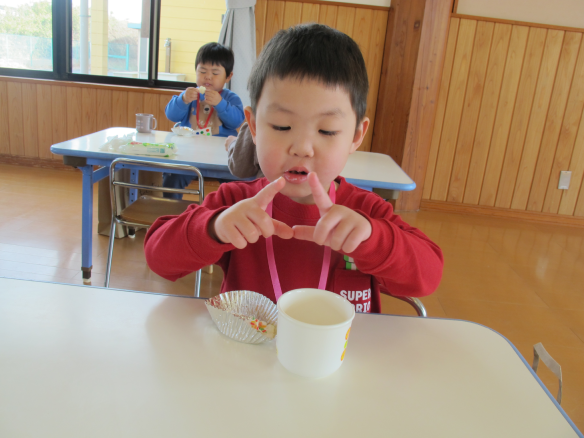 3月の幼児組の誕生会です。修了式直前の実施となりました。背景は修了式の装飾です。一層雰囲気ある誕生会となりました。
