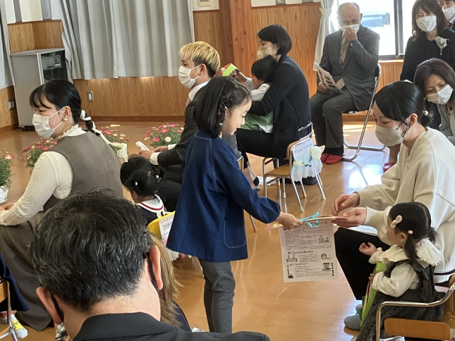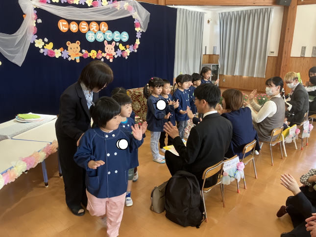 修了式では大変お世話になりありがとうございました。修了生10名は小学校への希望を胸に旅立ちました。1時間弱の長い式でしたが、みんな熱心に話を聞き積極的歌うことができました。節目となる修了式は自分のことはもちろんお世話になった方々を見つめ直すとても良い機会になります。またひとつひまわり組さんは大きくなったことでしょう。