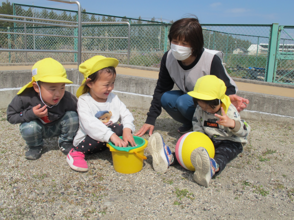 今日は天気も良くみんなお外で気持ちよく過ごしました。ありを見つけたり草を抜いたりして思い思いに過ごしていました。音楽が鳴ると中央に集まって体操です。みんな笑顔で体操しています。