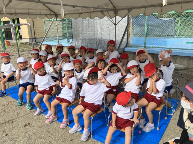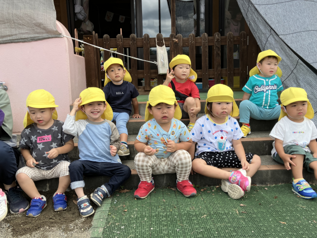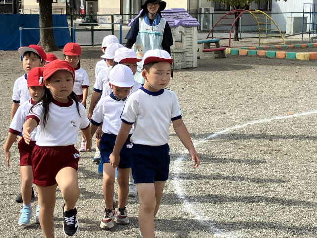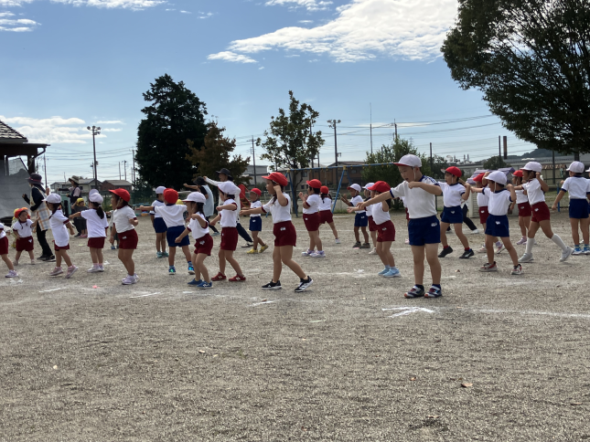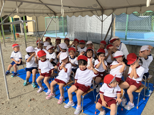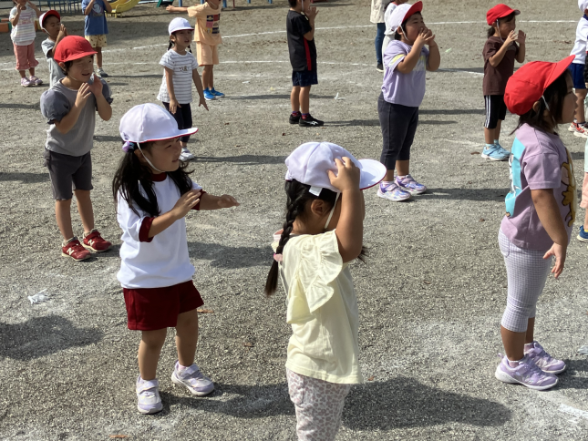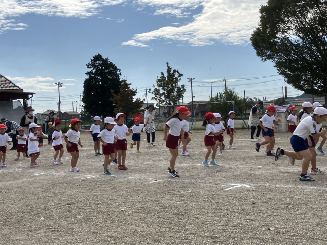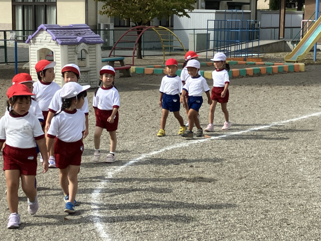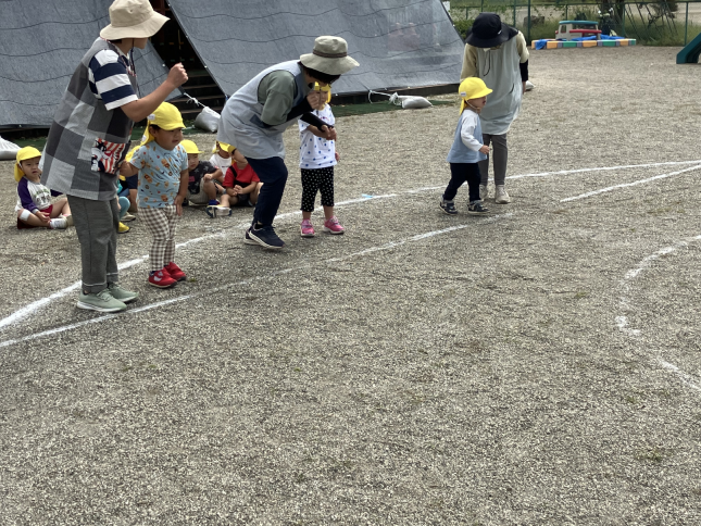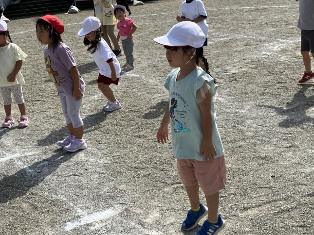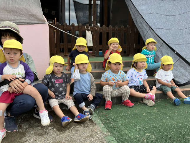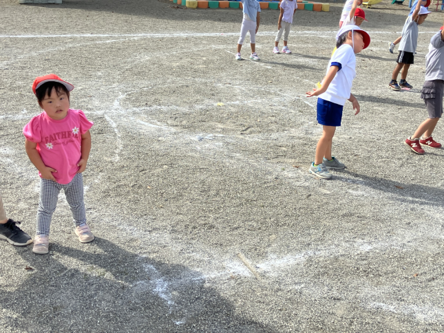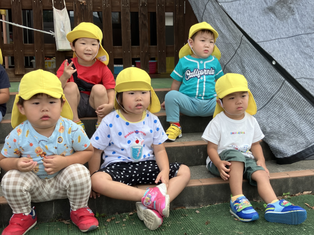 幼児組の運動会の練習をたんぽぽ組のみんなが楽しく応援しています。来年のことを思い浮かべているのかな。