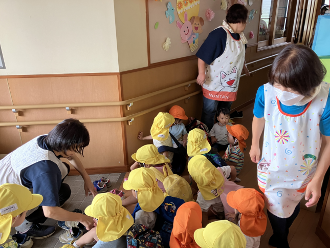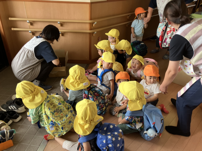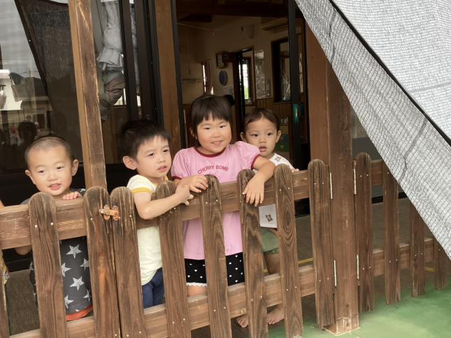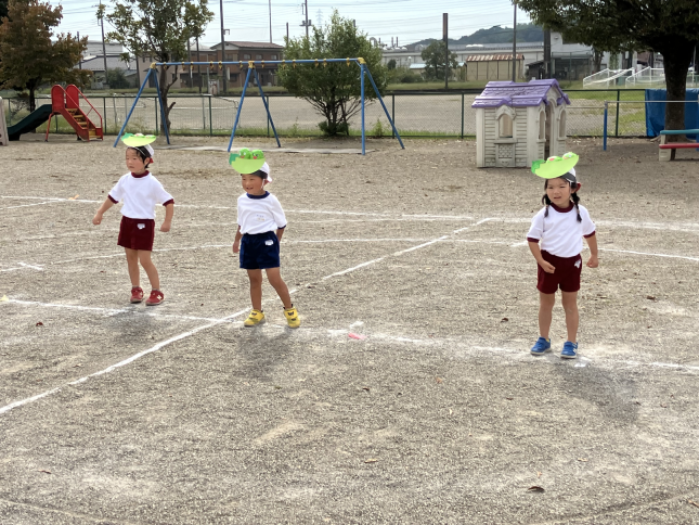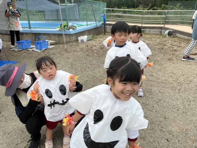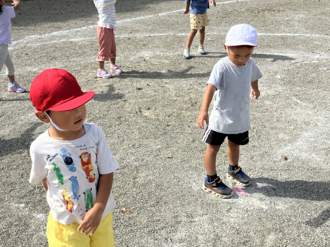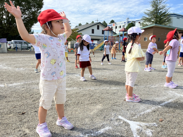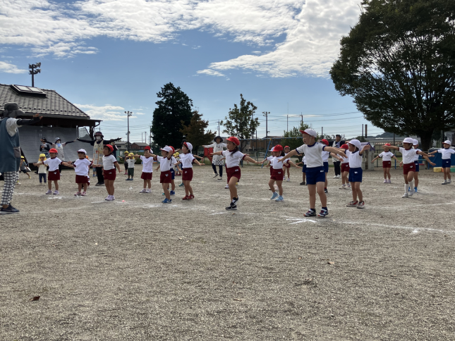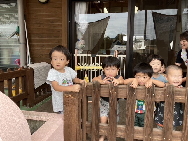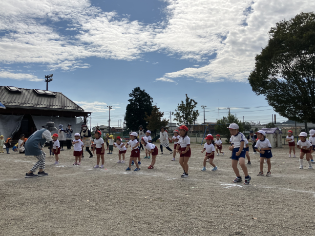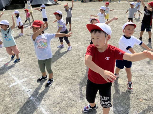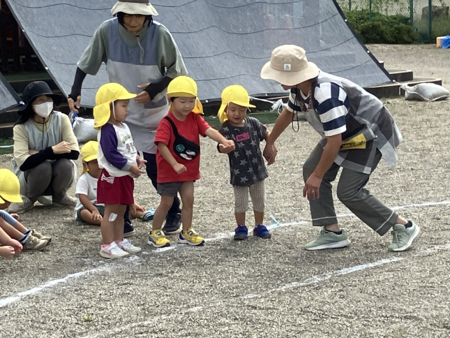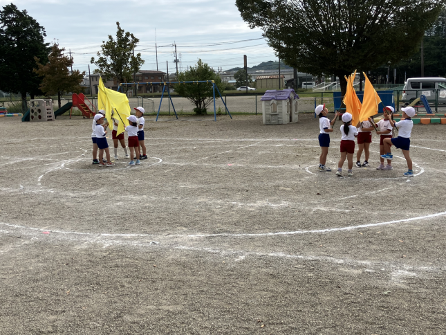 幼児組の運動会の練習をたんぽぽ組のみんなが楽しく応援しています。来年のことを思い浮かべているのかな。