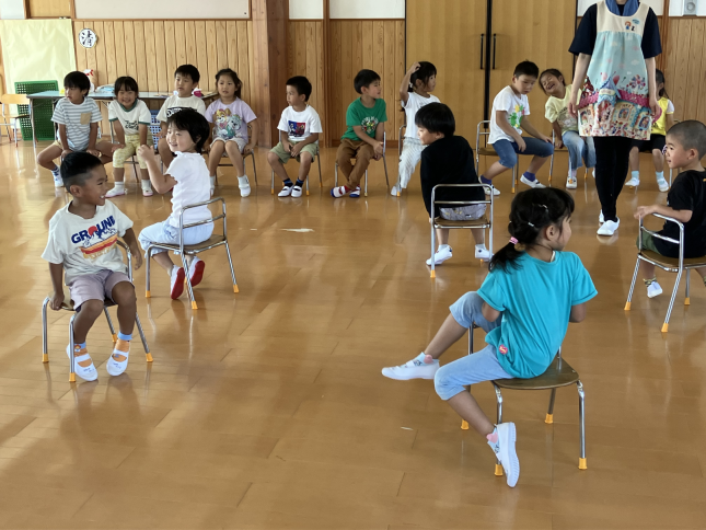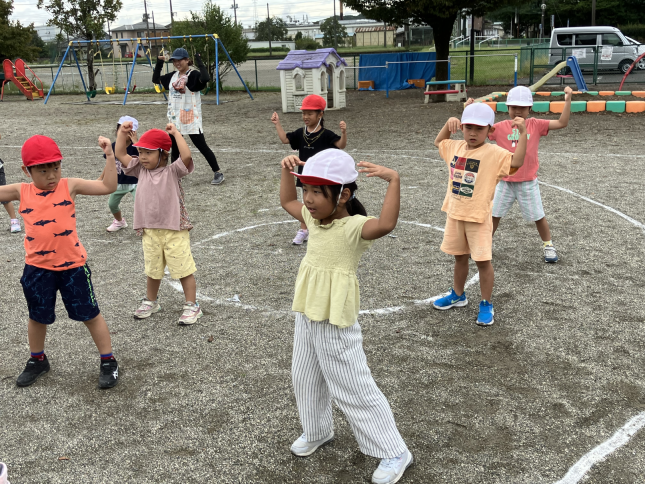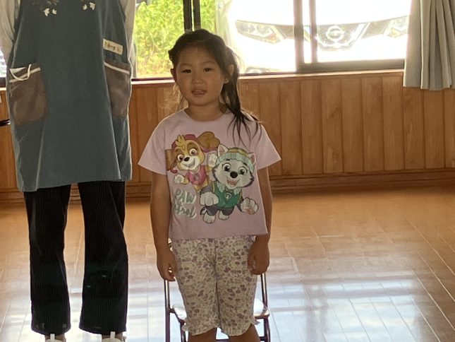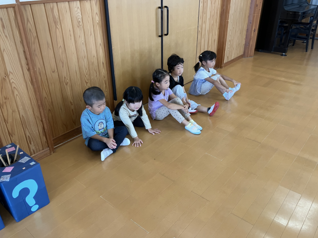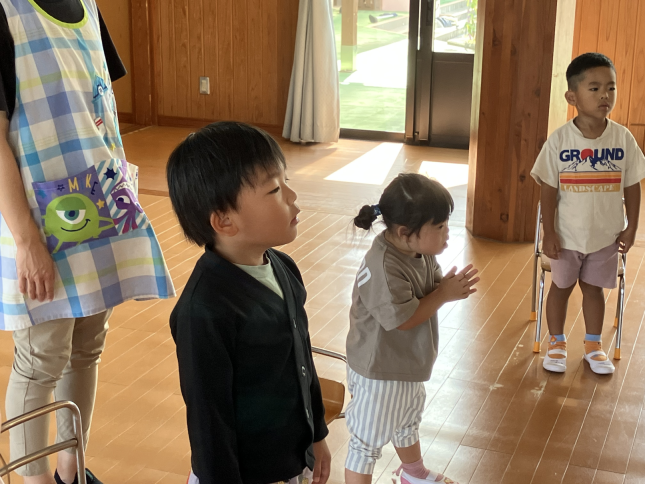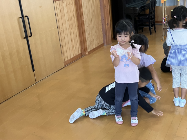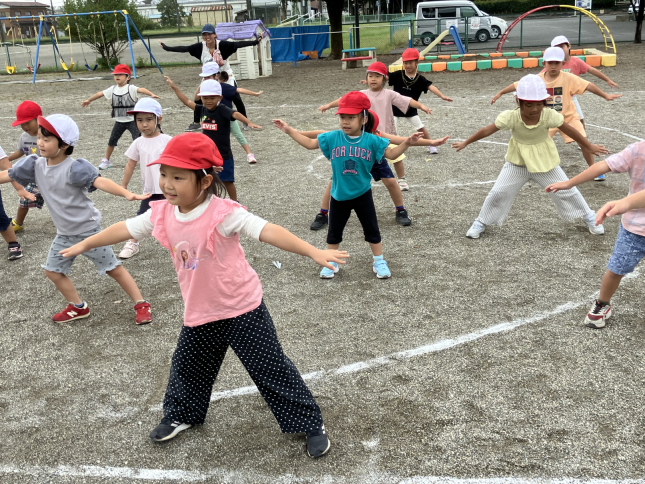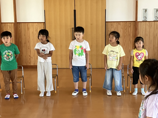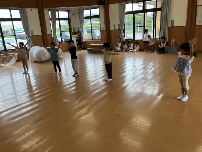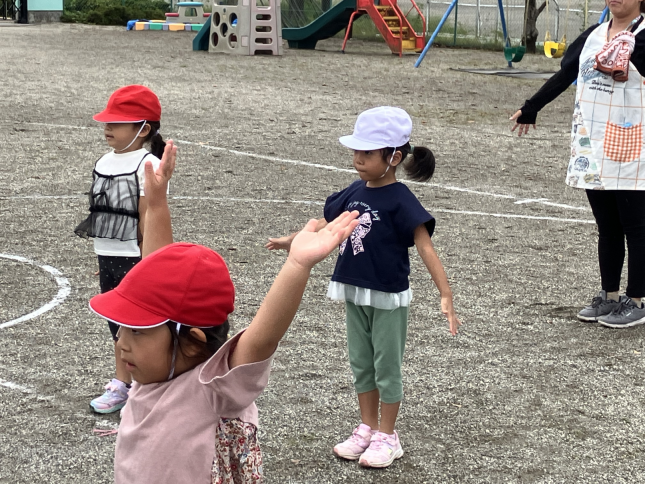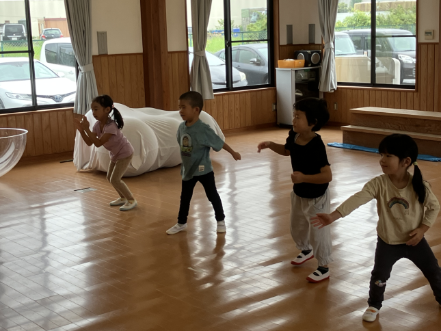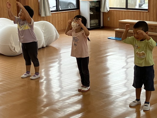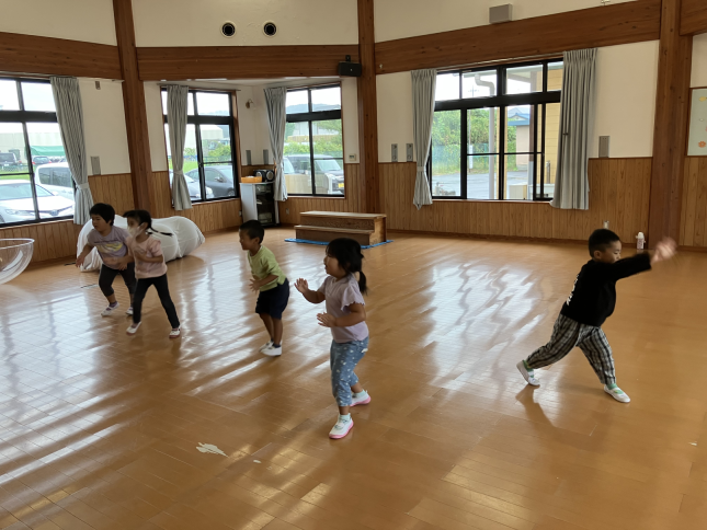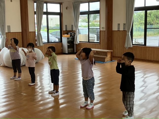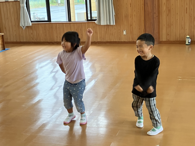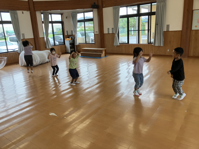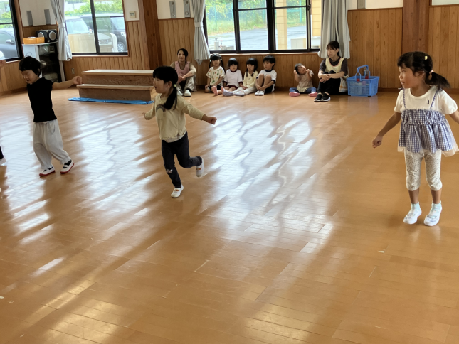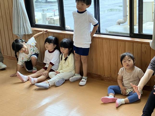 今日は雨でしたので屋内で練習をしました。ばら組は半分に分かれてお互いのリズムの動きをチェックし合いました。伝える対象が明確であるとモチベーションアップにつながります。