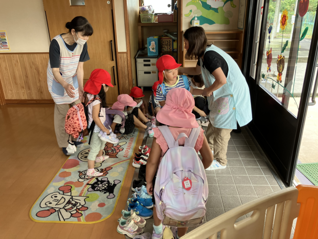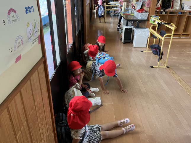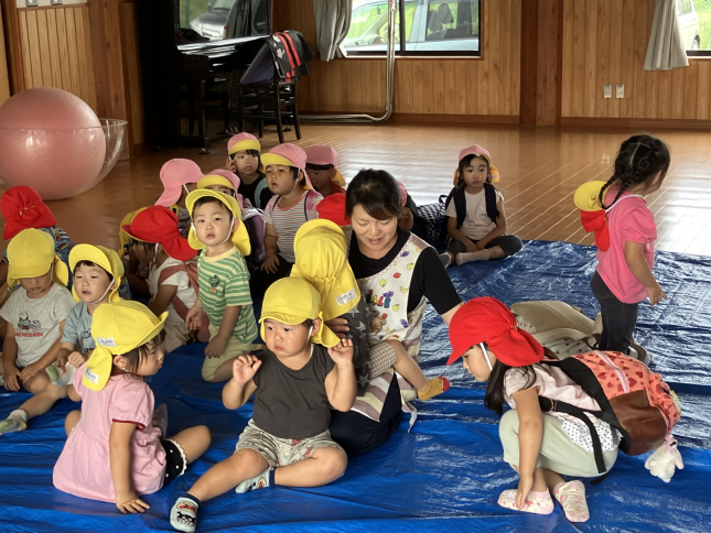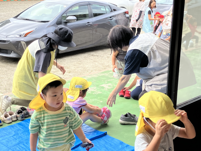 水害を想定した避難訓練を実施しました。職員の車に玄関から乗り、そこから園庭まで避難後清州第二小を想定して遊戯室に全員が避難するという流れです。