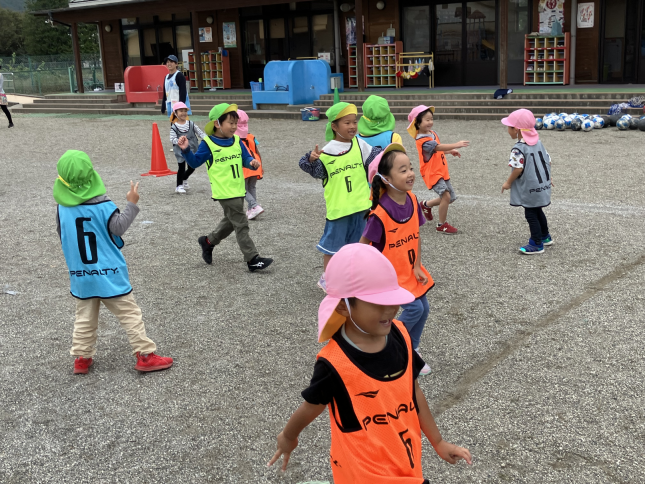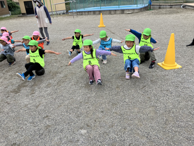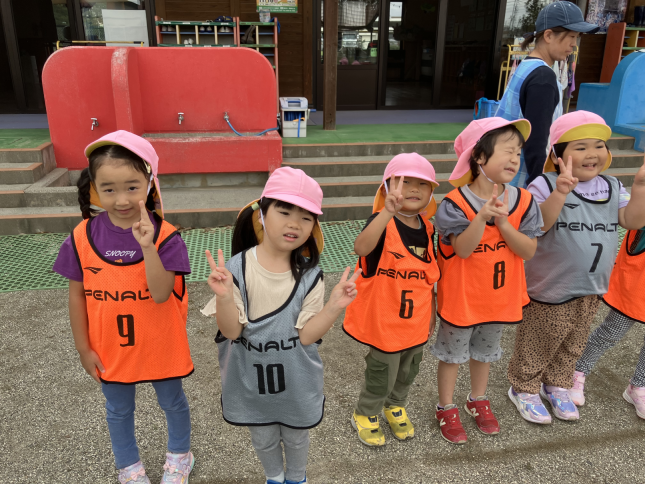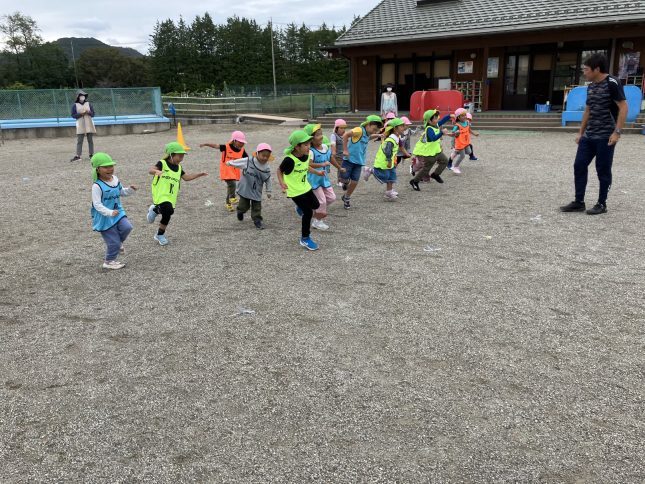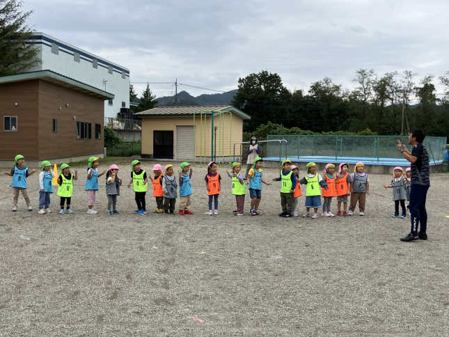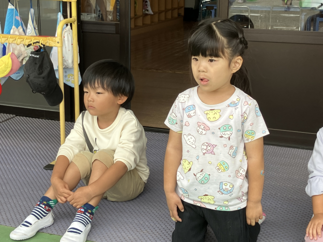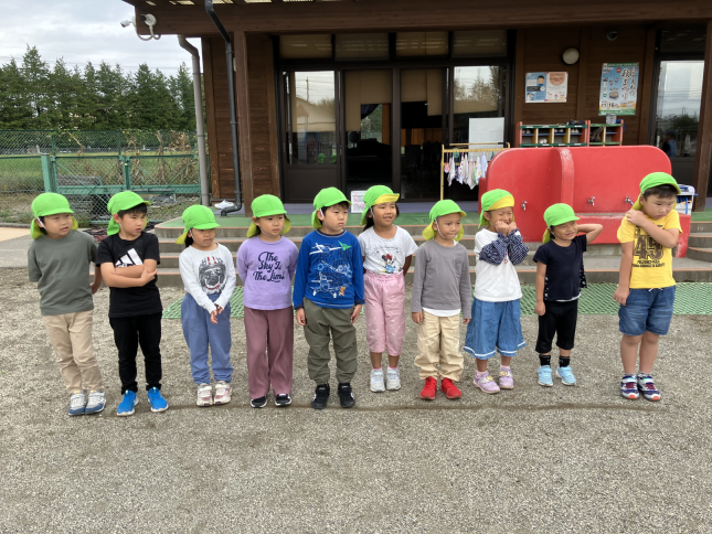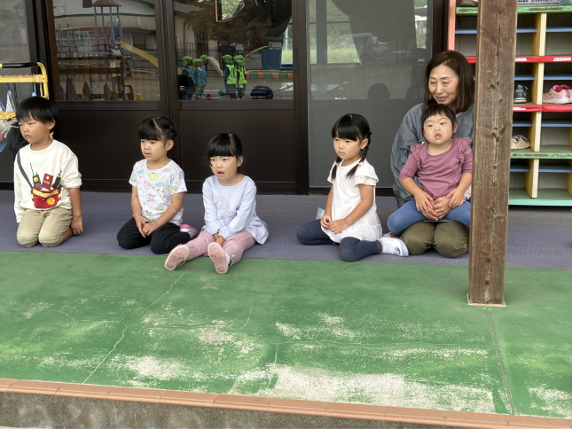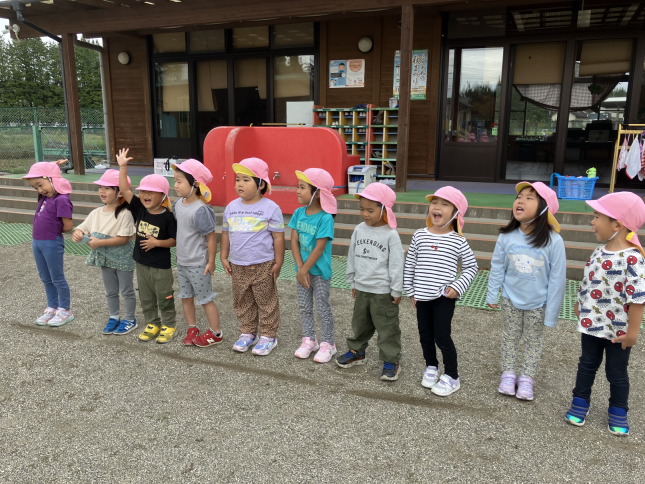 今日は地震の避難訓練がありました。最初は園庭に避難して次は建物崩壊の可能性があるということからコミセンに2次避難をしました。皆神妙な表情で落ち着いて避難できました。