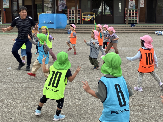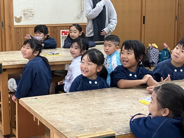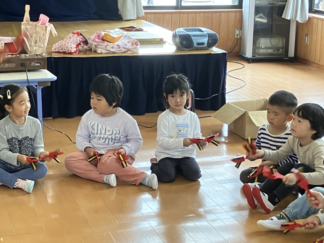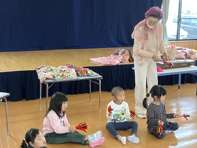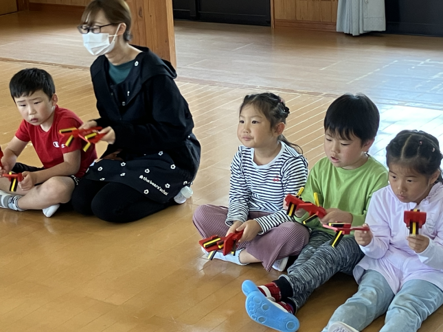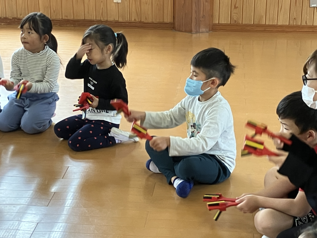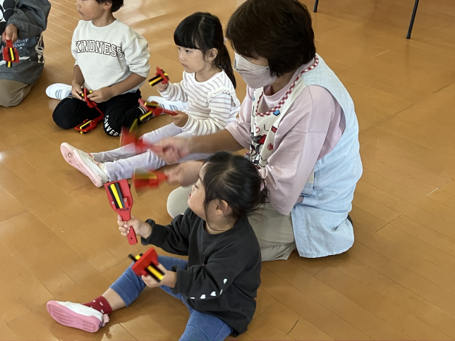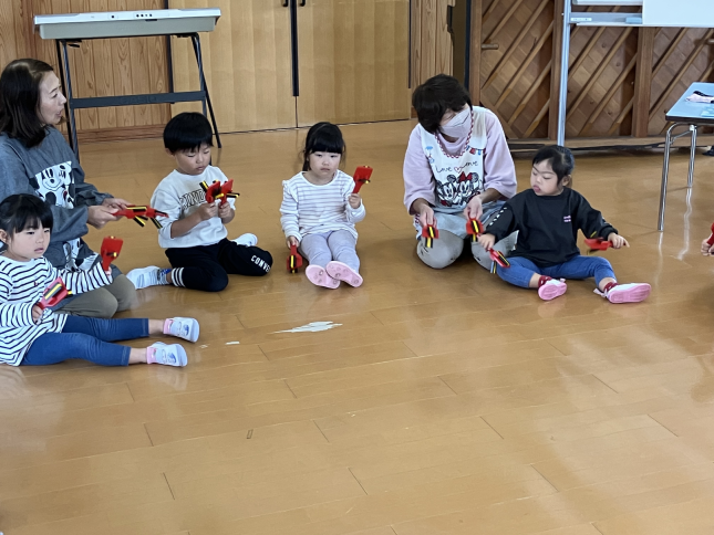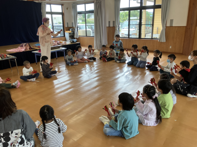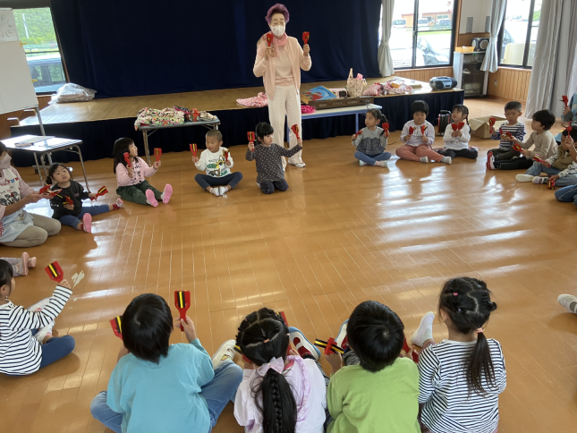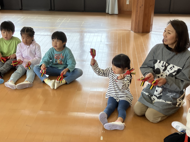 落合先生をお招きしてリズム遊びをしました。リズム遊びはリズムを合わせるために考え、調整したり、タイミングをはかったりしながら思考力が身に付きます。みんなとリズムを合わせることで楽しくなります。