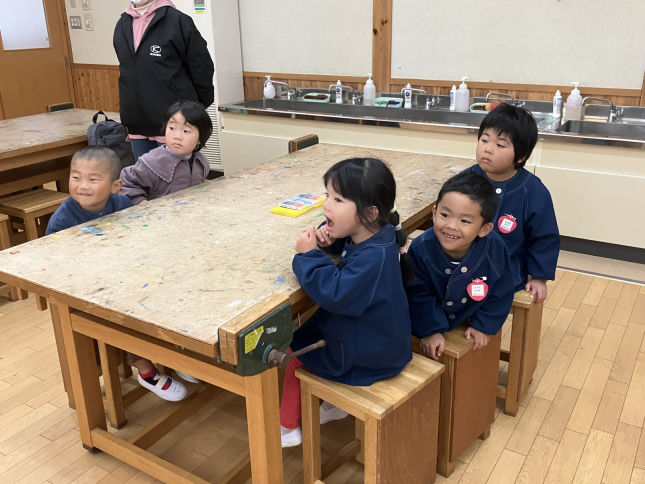 幼児組の誕生月の子は一人でした。みんなから祝福されちょっとはずかしいけどとってもうれしいです。回りのみんなもお祝いするのがとっても楽しい様子です。