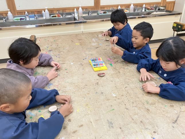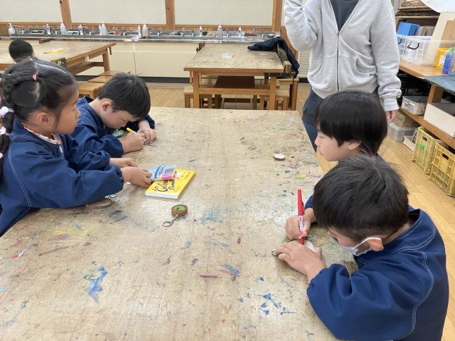 板荷自然体験交流センター、いちごっこ広場に行きました。交流センターではキーホールダーづくりをしました。センターの先生の話をしっかり聞いて自分の好きな図柄を描きました。熱心に話を聞く様子が印象的でした。成長ぶりにびっくりしました。