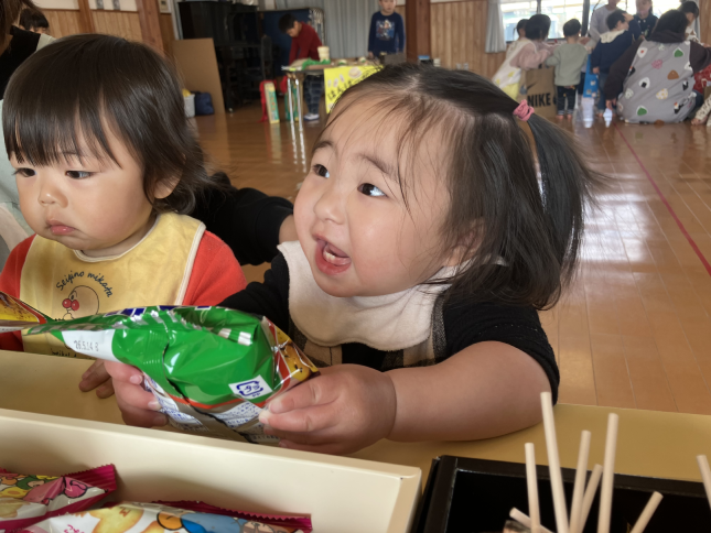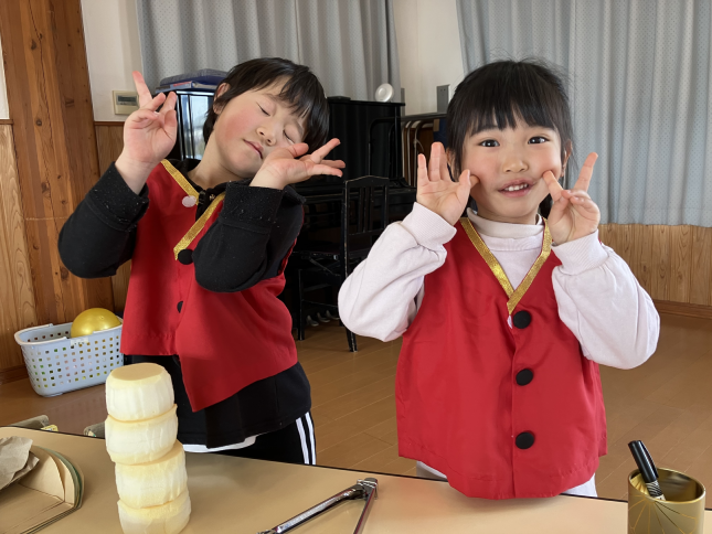 ばら組のみんなひまわり組さんと役割をチェンジして今度はお客さんを接待します。来年はひまわり組さんだけにしっかり接客できます。