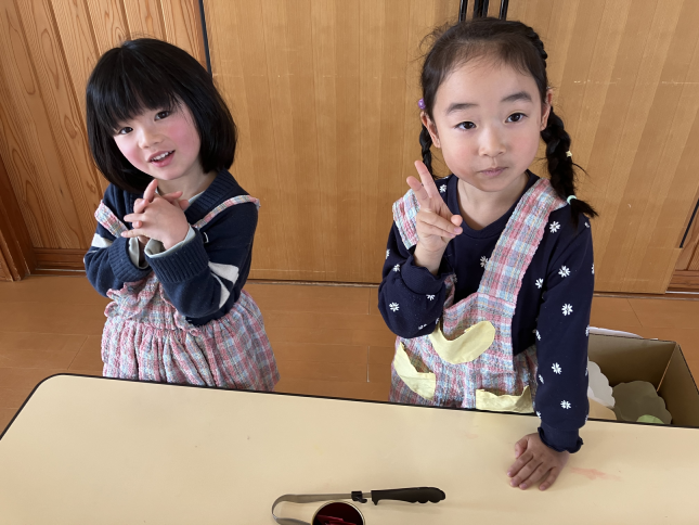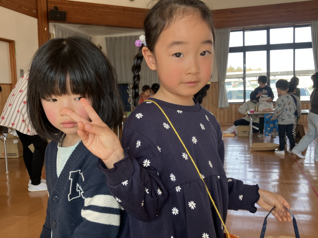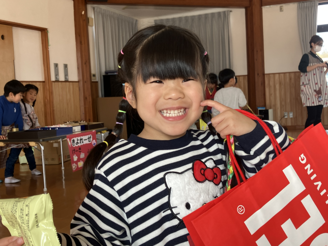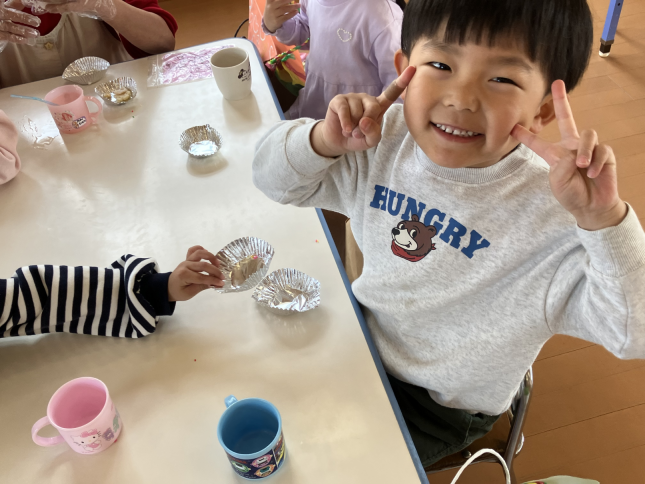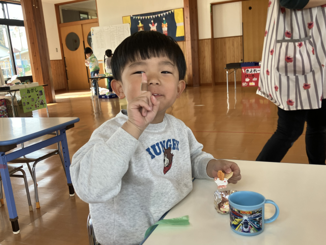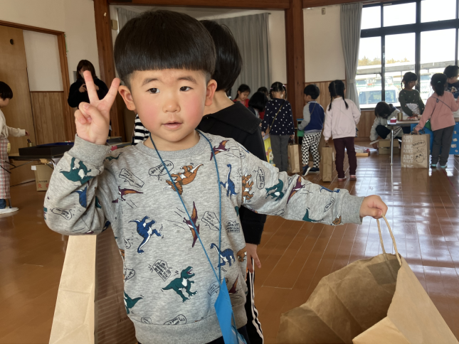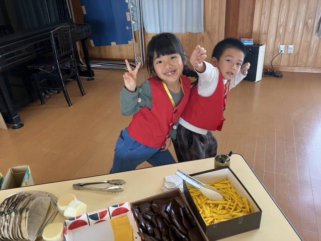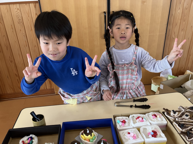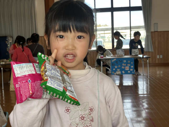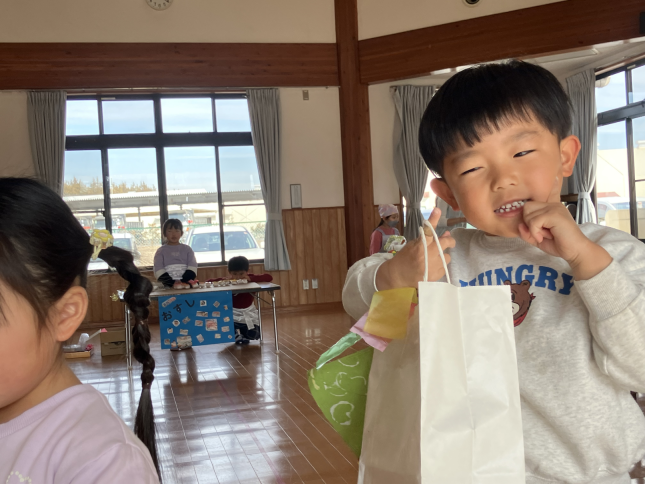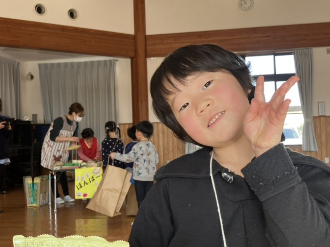 ひまわり組の子たちが中心になっておみせやさんごっこを実施しました。手作りのお菓子やおもちゃ、そしてレストランまであります。ひまわり組のみんなは1月からずっと準備してきました。「みんなによろこんでもらう」という大きな目標の下、制作に力を入れ、お客さんとのやり取りといったコミュニケーション力の育成を図りつつ楽しく有意義なひとときを過ごしました。お客さんの他のクラスの子も愛情いっぱいのおもちゃやお菓子を買って大喜びでした。
