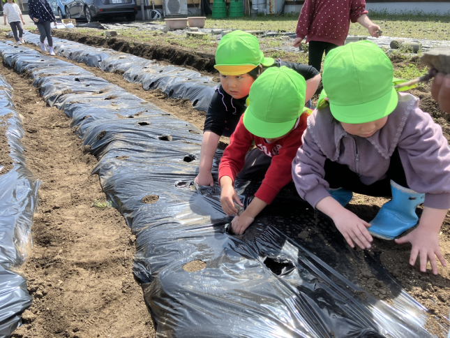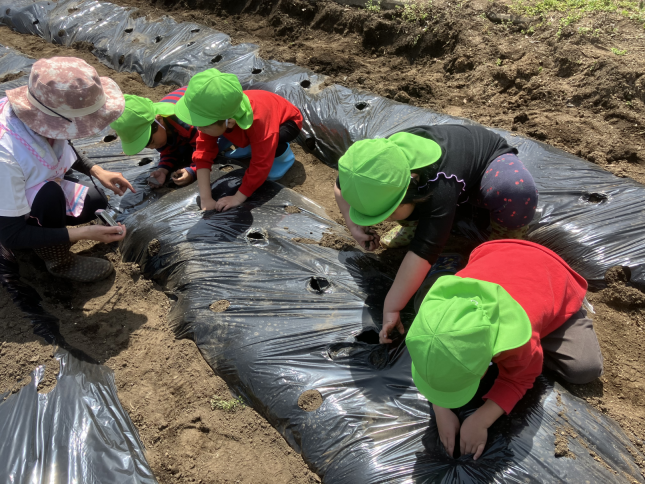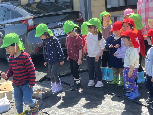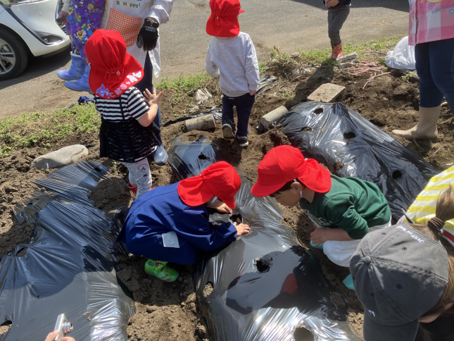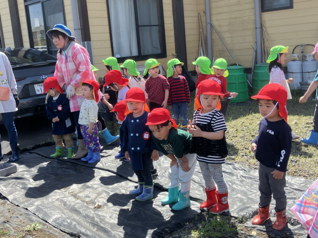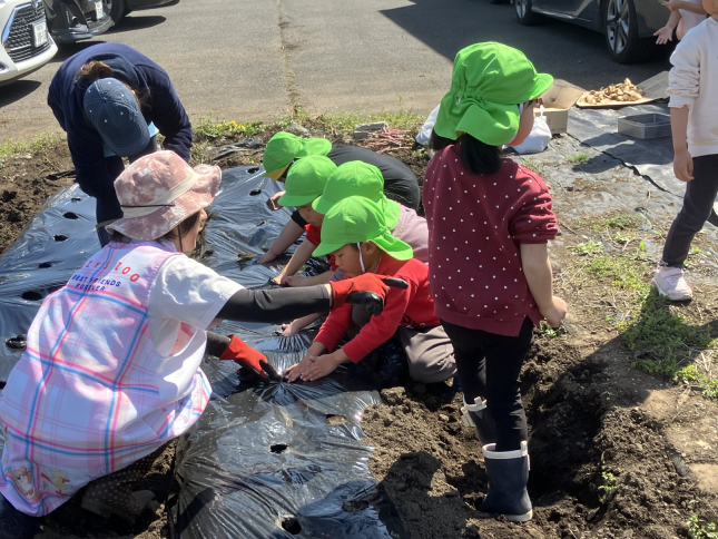 じゃがいも植えが完了しました。幼児組みんなで協力して一つひとつ丁寧に植えていきました。初めてじゃがいもを植えた子もいたと思います。やがて収穫できた時は喜びもひとしおでしょう。