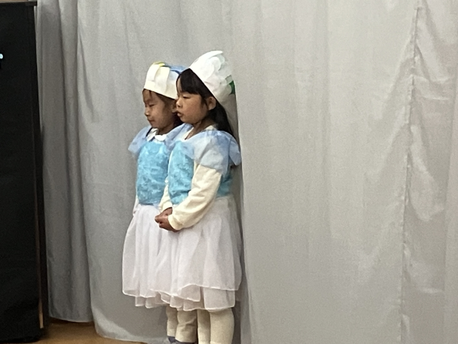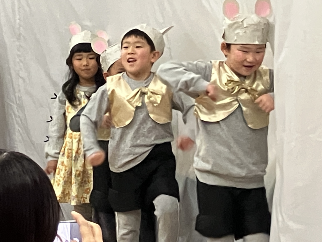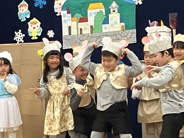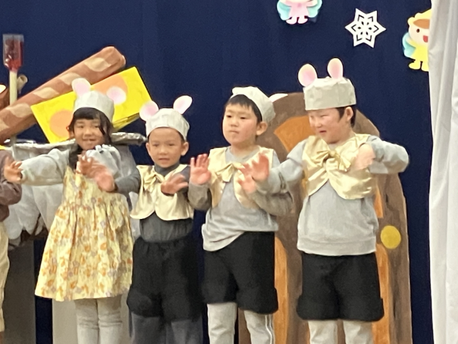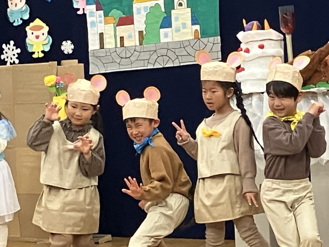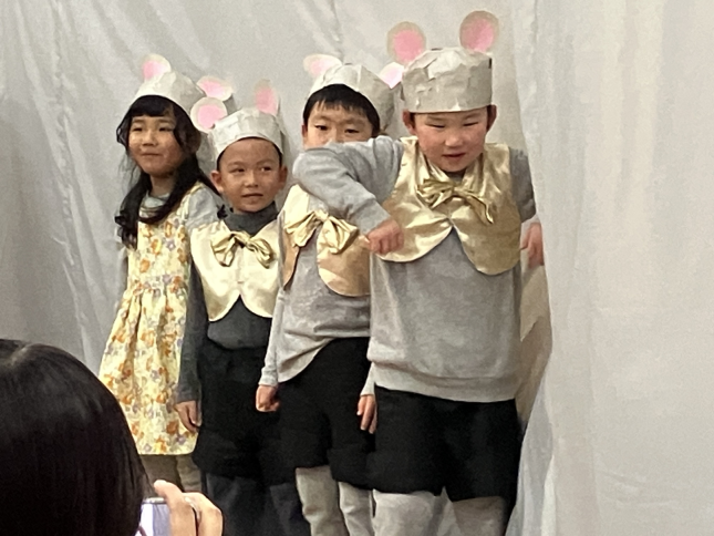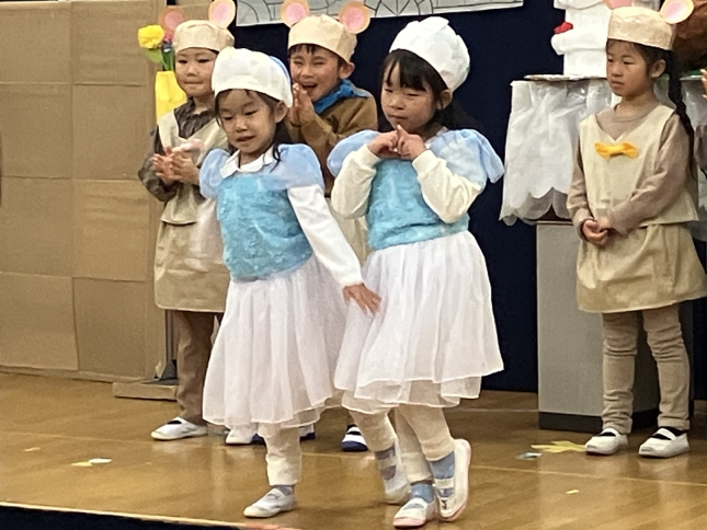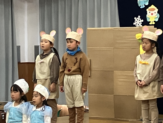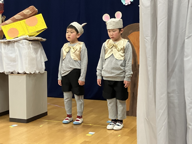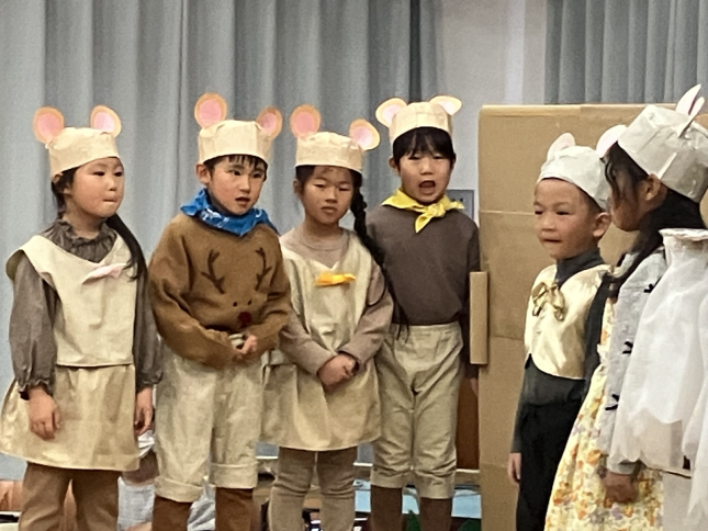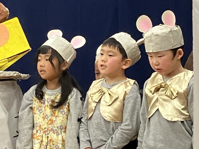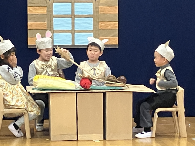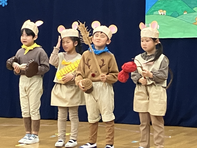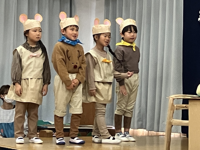 ひまわり組は「田舎のねずみと町のねずみ」の劇を演じました。一人ひとり役になりきって登場人物(ねずみ?)の心情に浸っていました。
