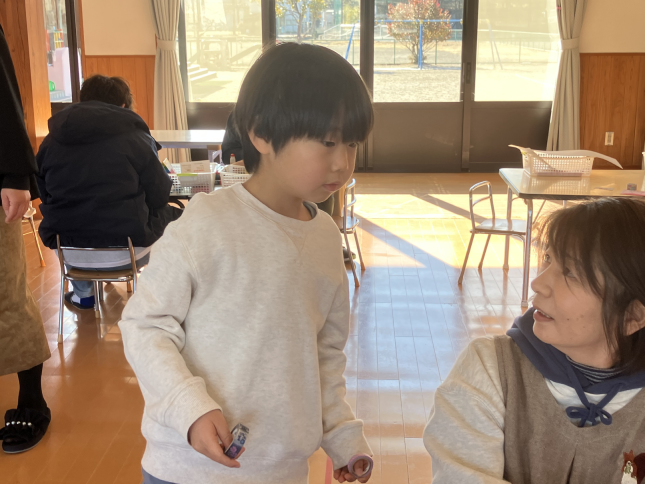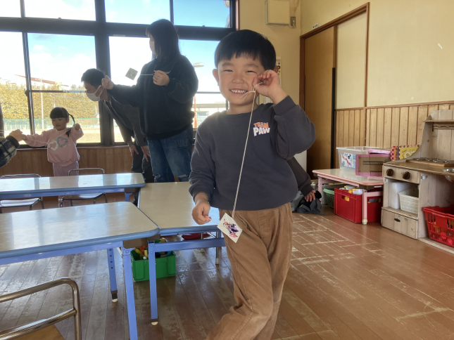 すみれ組の保育参加にご参加くださりありがとうございます。すみれ組ではブンブンコマを使ってみんな喜んで遊んでいました。なかなか手にする機会も少ないので貴重な体験をしました。