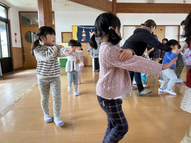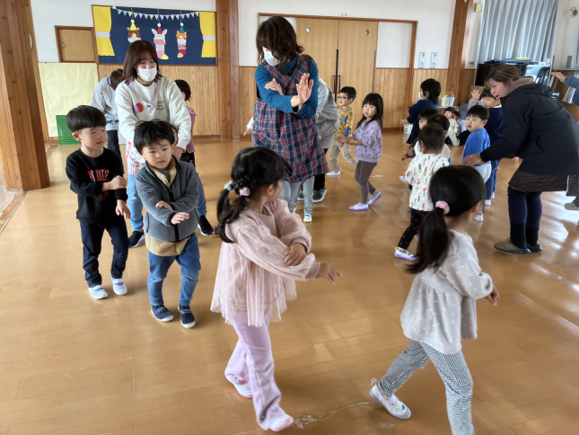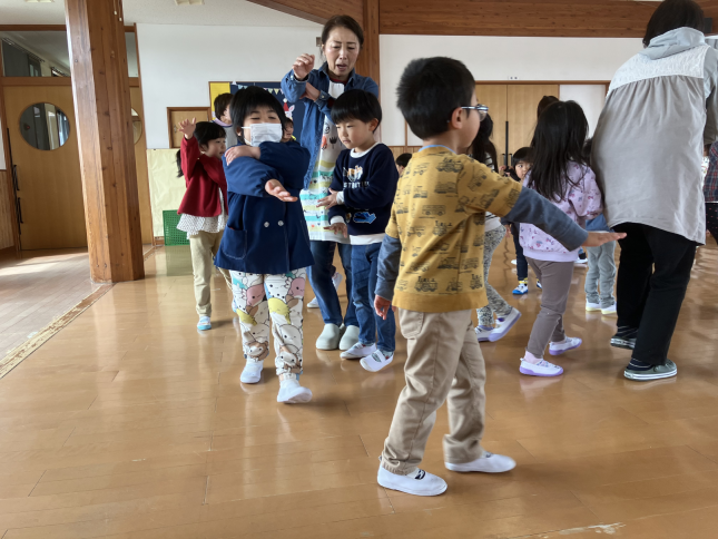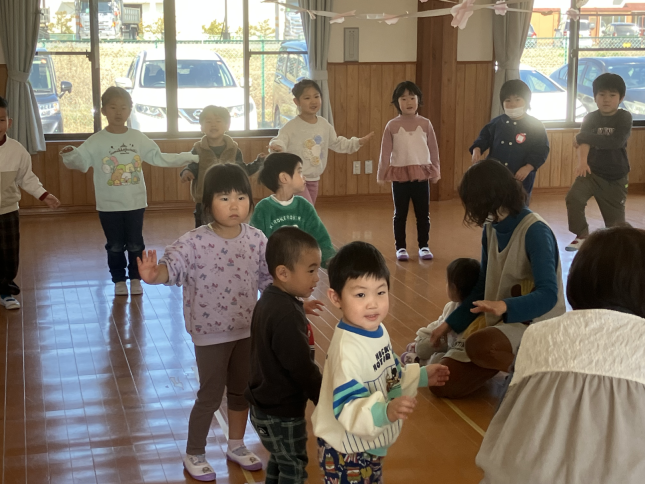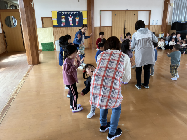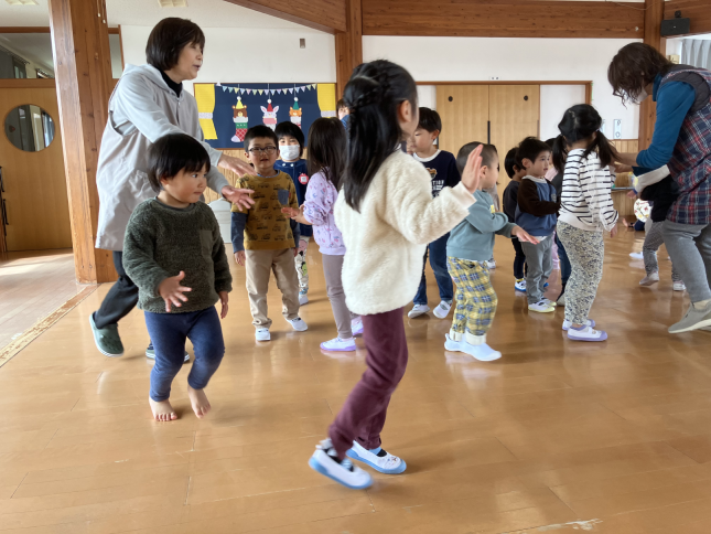 もうすぐ幼児組になるたんぽぽ組の子は幼児組と交流活動をしました。ピアノに合わせ一緒にリズム遊びを楽しみました。たんぽぽ組のみんなの真新しい上履きがかっこいいです。